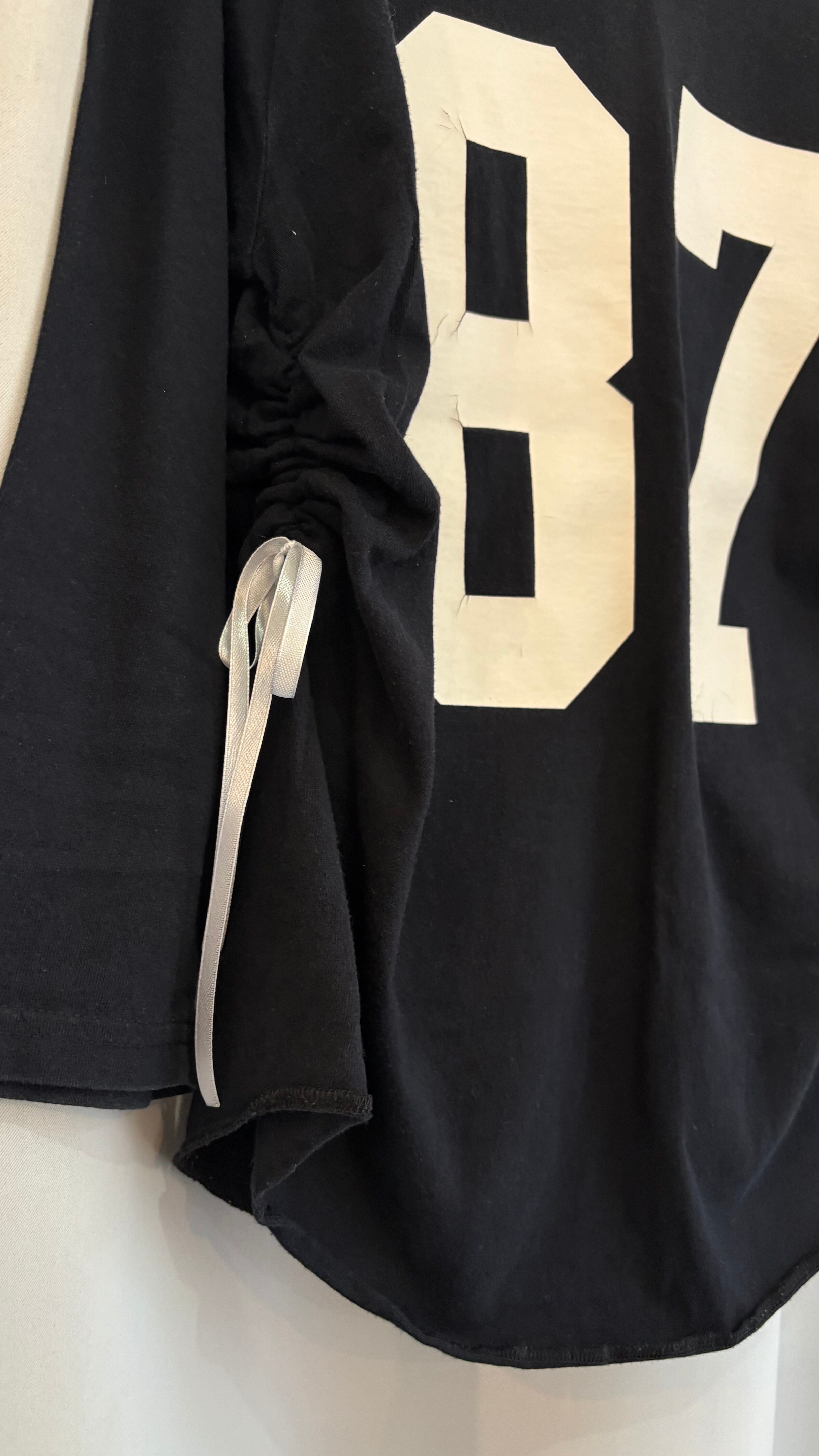 "remake" side gather ribbon numbering tee