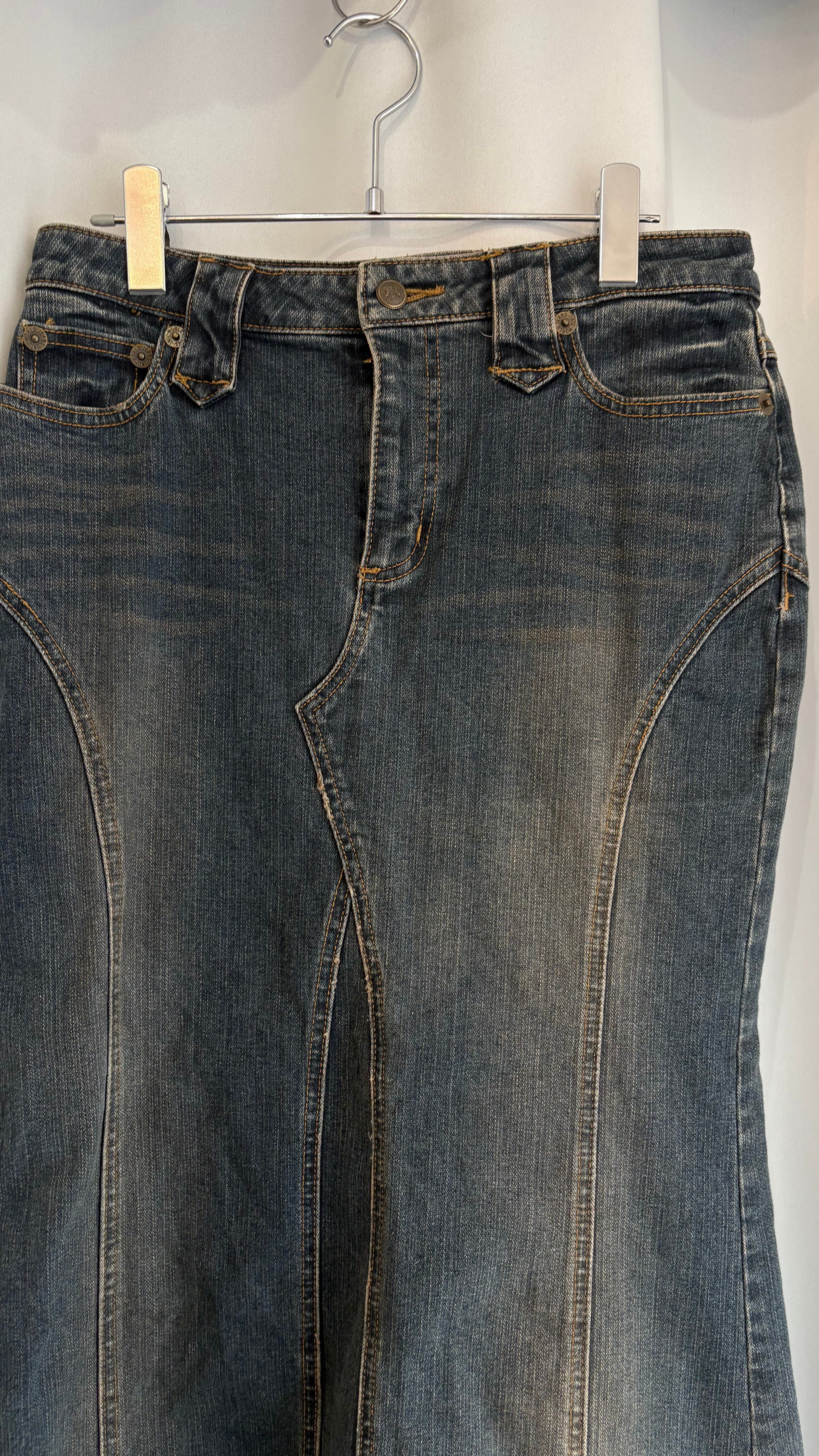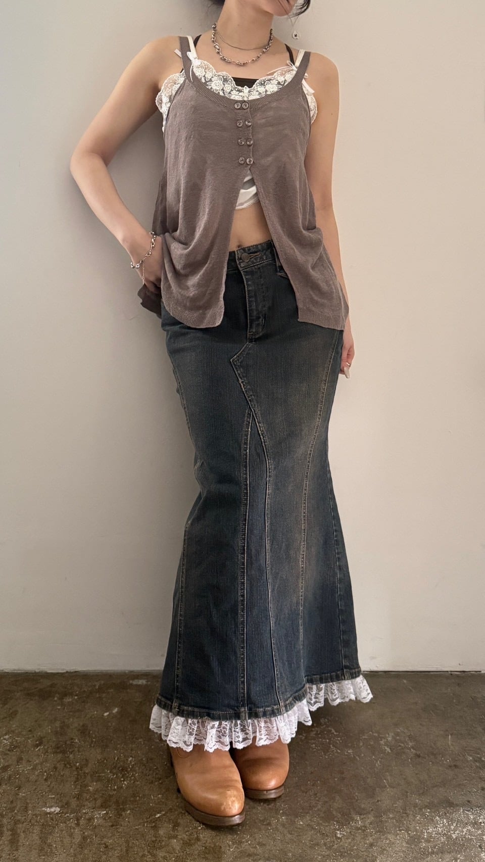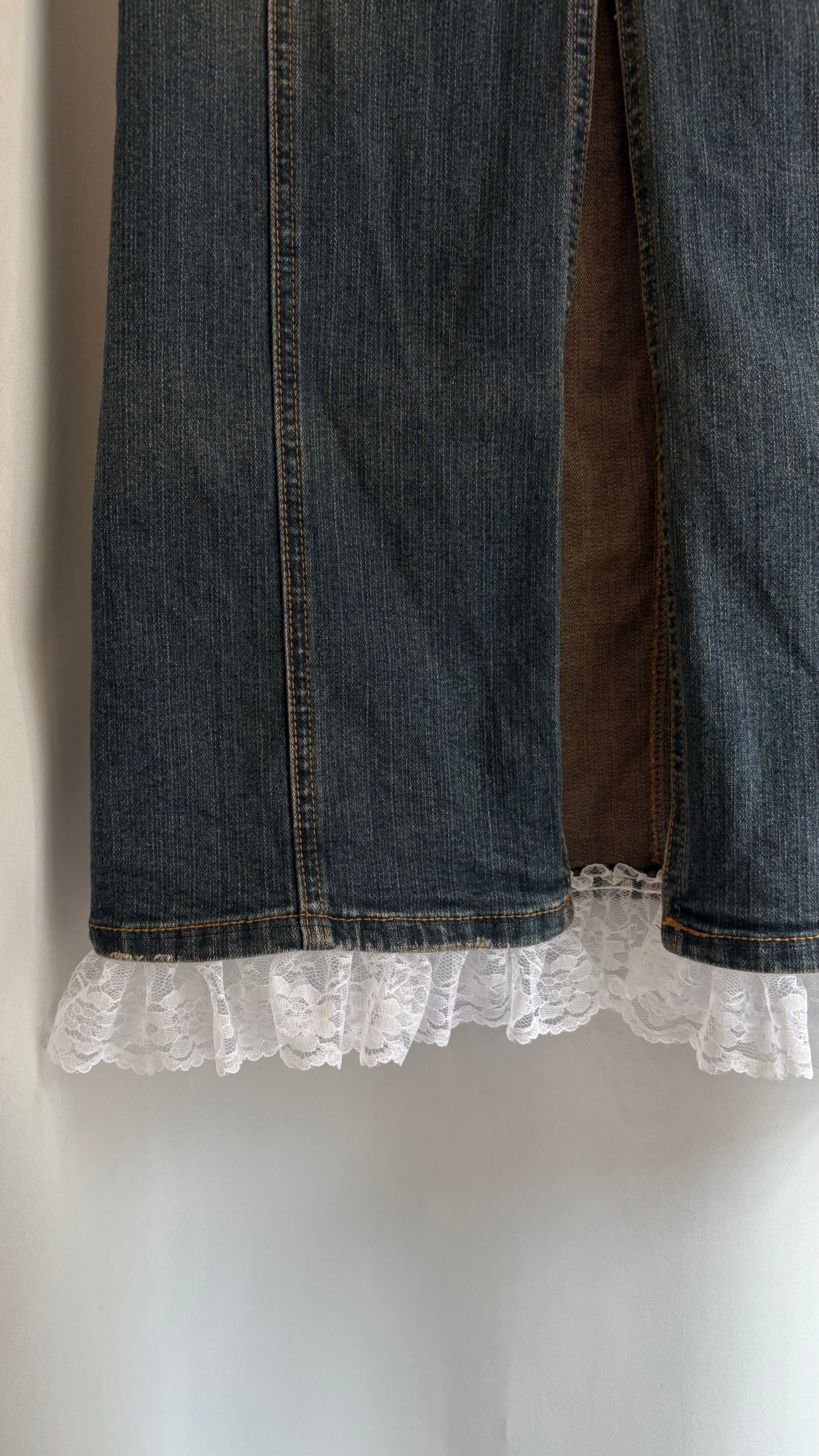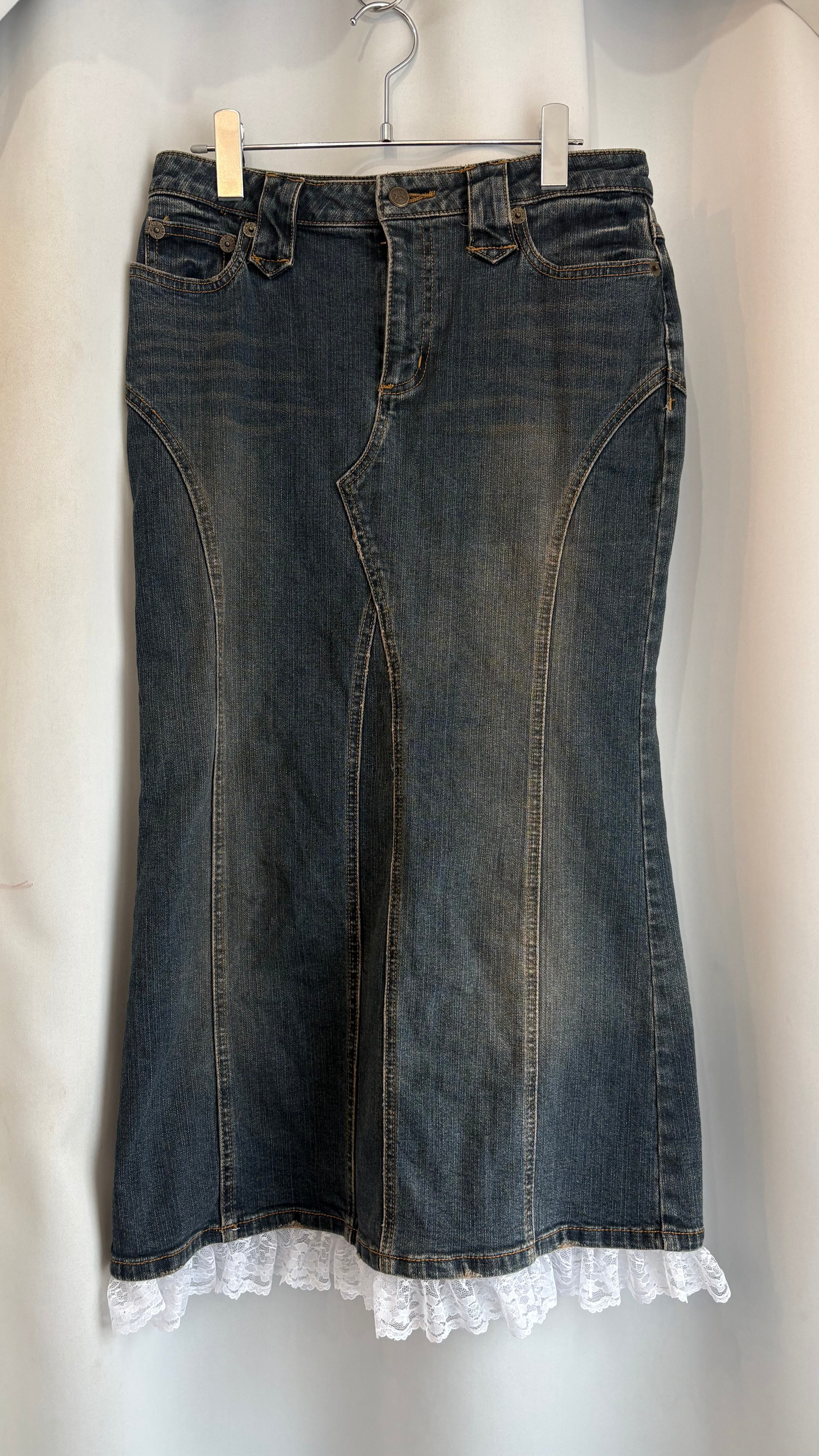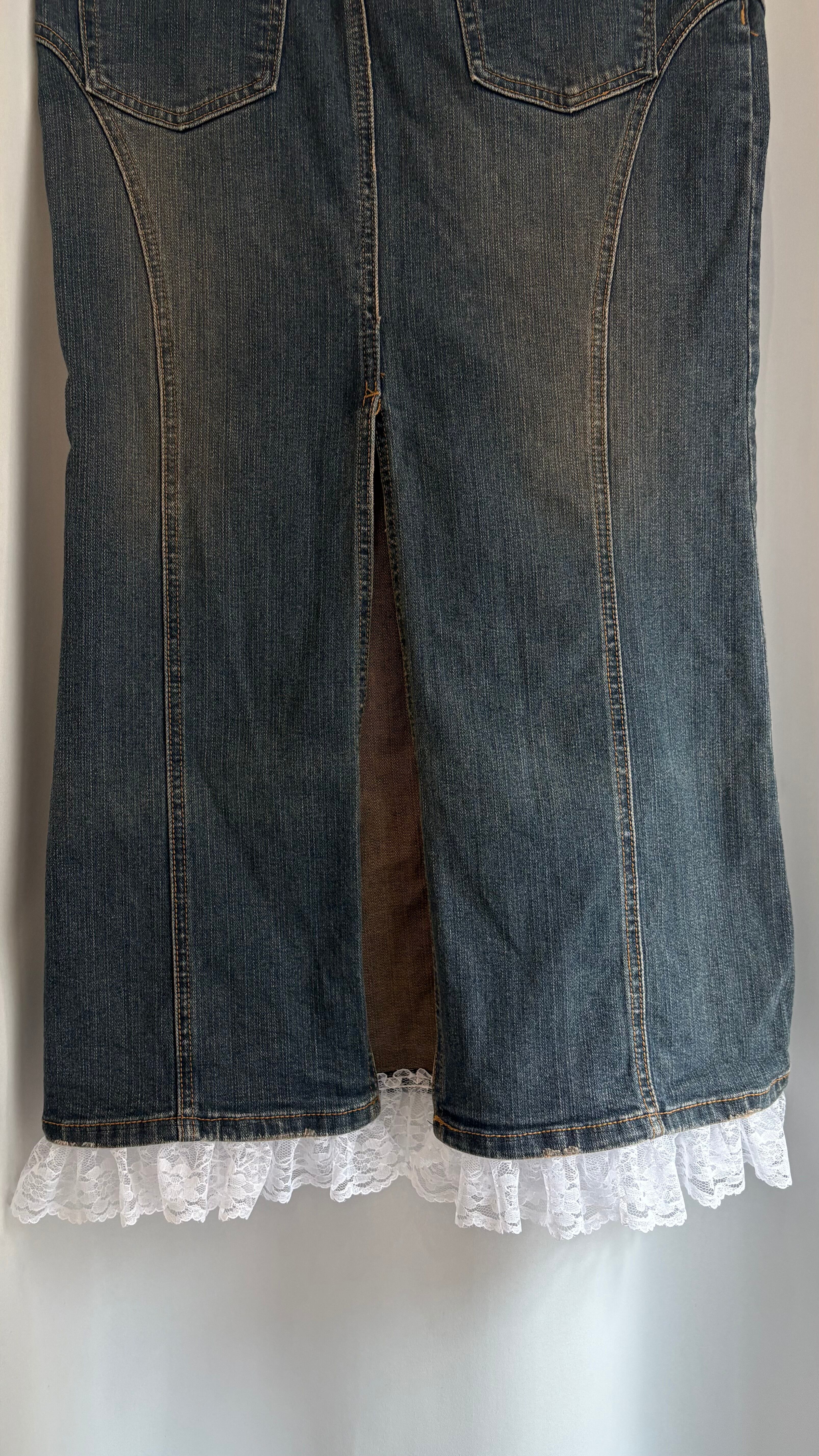 "remake" hem frill lace back slit denim skirt